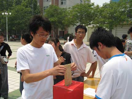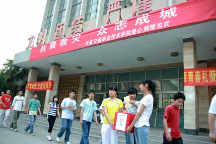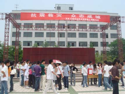 5月15日中午,在南院文化广场和北院礼堂门前开展了由学工处、院团委共同组织的“河南交通职业技术学院情系灾区爱心捐赠活动”。我院广大学生踊跃捐款、慷慨解囊,积极为地震灾区奉献自己的爱心,短短两个小时的捐赠活动共筹集善款3万多元。
