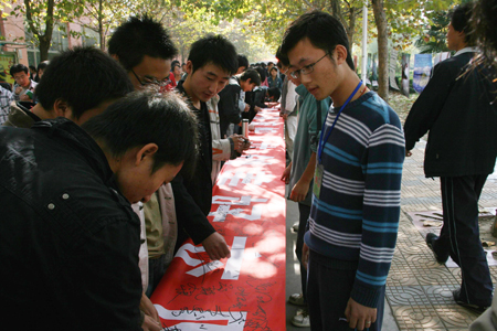 参加活动的同学们纷纷表示将积极地投身于环保活动中,并在写有“同举环保旗帜 共创美好交院”的20余米长的红色条幅上签上了自己的名字。