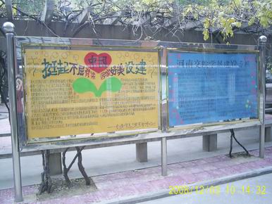 一是大力进行校园文化环境改造,营造良好的校园文化氛围。北校区在校园文化创建工作中存在着先天不足的情况。交通信息工程系来到北院后,根据校园实际情况,因地制宜努力改善校园文化环境,不断建设和改造校园文化传播设施,开辟了灯光报栏、灯光橱窗、班级宣传橱窗、社团文化展示橱窗。利用报栏使学生及时了解时政、新闻,班级宣传橱窗设立班级文化展板,宣传班级文化建设。