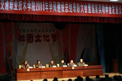 副院长夏连学宣读了《河南省教育厅、共青团河南省委员会关于表彰2008年河南省普通高等学校三好学生、优秀学生干部和先进班集体的决定》、《河南交通职业技术学院关于表彰2008年学风建设先进集体和先进个人的决定》和《河南交通职业技术学院关于确定2007-2008学年度国家奖助学金学生名单的通知》,与会领导为获得奖励的学风建设先进系部、先进班级、先进个人颁发了锦旗和证书。