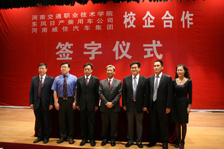 河南交通职业技术学院与东风日产、河南威佳签订校企合作协议后,将首先开办东风日产订单培养班。东风日产与河南威佳为学院提供可供培训的车辆及配件,学院提供培训场地、通用工具及师资等,共同培养汽车后服务市场需要的人才,河南威佳对于订单内的合格学员全部安排就业。三方还将定期进行学术交流,东风日产将安排讲师为学院教师进行培训,培训后的教师服务于“东风日产班”,威佳对培训提供支持。