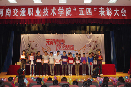 5月5日下午,为纪念五四运动九十一周年、弘扬“五四”爱国精神,学院在艺术中心隆重举行五四表彰大会,对学院过去一年团学工作中涌现出的先进集体和个人进行表彰。学院党委书记马健、党委副书记张浩、纪委书记夏青、工会主席贺少华、副院长华志坚、毛新年、张瑞春等出席了表彰大会,党办、学工处、团委、就业办及各系党团负责人、辅导员与400余名团员青年代表欢聚一堂。会议由张浩副书记主持。