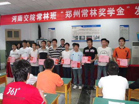 我院“郑州常林奖学金”是郑州常林贸易有限公司为鼓励我院“常林班”学员投身工程机械行业而设置的专项奖学金, 该项奖学金每年评选一次,每次奖金总额为10000元,今年是第二次颁发奖学金。根据常林班学员2009年的综合表现,晋大挥、王震东等5名同学喜获一等奖,每人奖金1000元,冯东华、李湘等10名同学分获二等奖,每人奖金500元。