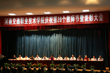 大会在庄严的国歌声中开幕。会上,宋华东处长宣读了省交通运输厅贺信。院党委副书记、院长李亚杰宣布了院党委《关于对08-09学年先进教育工作者、优秀教师、优秀辅导员进行表彰的决定》。出席会议的领导分别向老教师和受表彰老师颁发荣誉证书。