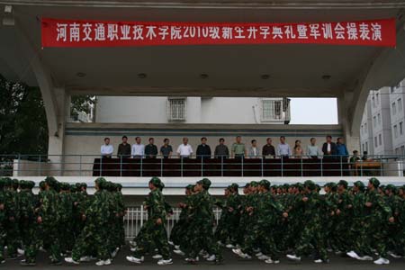 9月19日上午9时,我院2010级新生开学典礼暨会操表演在南校区田径场隆重举行。院领导李亚杰、任卫平、张浩、夏连学、贺绍华、华志坚、解福泉、毛新年、张瑞春与承训部队领导及各系党总支书记在主席台就坐,毛新年副院长主持仪式。