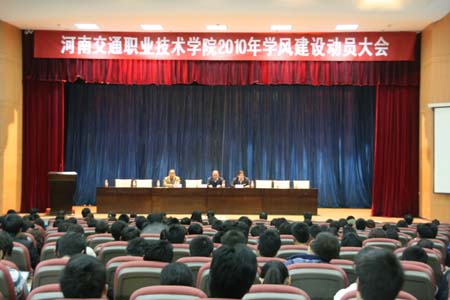 为贯彻落实《中共中央 国务院关于进一步加强和改进大学生思想政治教育的意见》和《教育部关于全面提高高等职业教育教学质量的若干意见》精神,切实加强我院学风建设,促进良好学风的形成,提高人才培养质量。我院决定开展学风建设活动,活动从11月初开始持续到本学期期末,分为宣传动员、组织实施、总结表彰三个阶段,力争通过学习校规校纪、整顿课堂纪律,强化考风考纪,狠抓校园安全稳定,开展学风建设先进班级评比活动等方式,大力推进学风建设。 11月5日,我院在南校区艺术中心报告厅举行2010年学风建设动员大会,学院党委副书记张浩,副院长夏连学、毛新年,教务处、学生工作处、院团委等部门负责人和各系部党总支书记、主任、学工办人员、辅导员及各班班长、团支部书记、学习委员参加会议。会议由毛新年副院长主持。 会上,夏连学副院长首先宣读了学院《关于印发< 河南交通职业技术学院2010年学风建设活动实施方案>的通知》,张浩副书记作了重要讲话。他首先阐述了我院开展学风建设的重要意义,并分析当前我院学风建设中存在的主要问题。要求学风建设活动要坚持以领导重视与合理部署推进学风建设,以教育引导和规范管理相结合的原则促进学风建设,以加强班级建设深化学风建设,同时,加强学风建设的评估与考核,建立师生良性互动、互相激励、互相制约、互相监督的激励机制,对在学风建设工作中取得优异成绩的集体和个人给予鼓励和表彰,对学风建设中问题严重的集体和个人,要进行批评或处分,积极为学生健康成长、成才创造良好的氛围。教师代表和学生代表也分别作了发言。 目前,我院学风建设活动正在全院范围内有序进行。