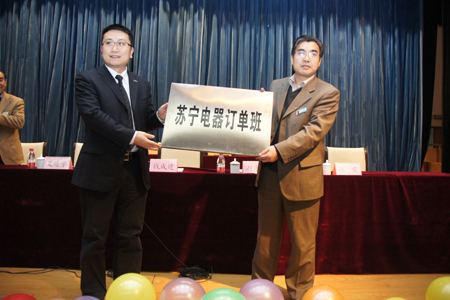 签字仪式由毛新年副院长主持,夏连学副院长为签字仪式致辞并为苏宁电器有限公司授“教学基地”牌匾。钱成建总经理对“苏宁电器订单班”进行了授牌,对我院的教学环境和学生素质进行了高度评价,对订单班同学寄予厚望。