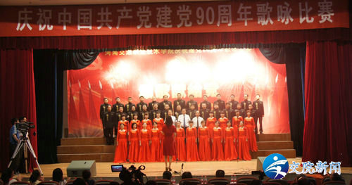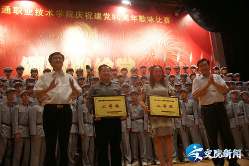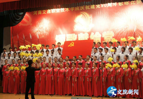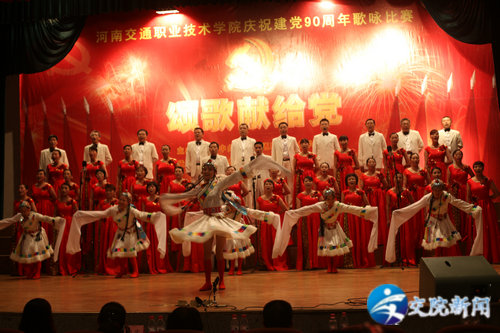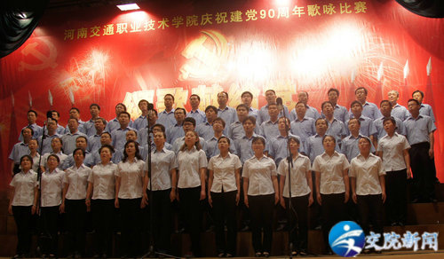 (院领导为获奖部门颁奖) 为庆祝中国共产党成立90周年,歌颂党的丰功伟绩,弘扬党的优良传统和作风,展示我院师生昂扬向上、团结一心的精神风貌,促进创先争优活动的深入开展。6月1日下午,学院在艺术中心隆重举行庆祝中国共产党成立90周年歌咏比赛。 比赛前学院党委书记徐强发表了热情洋溢的讲话。河南省交通运输厅领导霍金花、王晓共、马健、曹焱、张丽、许建军等与学院领导徐强、李亚杰、张浩、夏连学、夏青、华志坚、毛新年、张瑞春等一同亲临现场观看比赛并为获奖单位颁奖, 比赛以学院离退休老同志合唱队一曲满怀深情的《我和我的祖国》拉开序幕,各参赛队以高昂的激情和别具一格的表演充分展现了各自的精神风貌和艺术风采,他们以动听的歌声,优美的旋律抒发了对党对祖国的无限热爱之情,表达了对红色历史的缅怀,及对未来的美好憧憬,博得在场观众的阵阵掌声。 本次歌咏比赛共有十三个代表队参赛,师生同台演出,经过紧张的角逐,经济管理系学生代表队荣获一等奖,机关联队、总务处代表队荣获二等奖,交通信息工程系学生代表队、人文社科系教师代表队及学生代表队荣获三等奖,汽车工程系教师代表队等荣获优秀组织奖,离退休老同志代表队荣获特别奖。