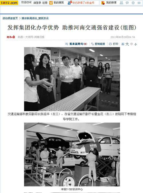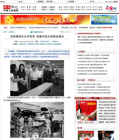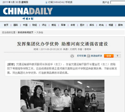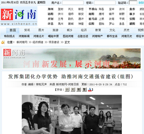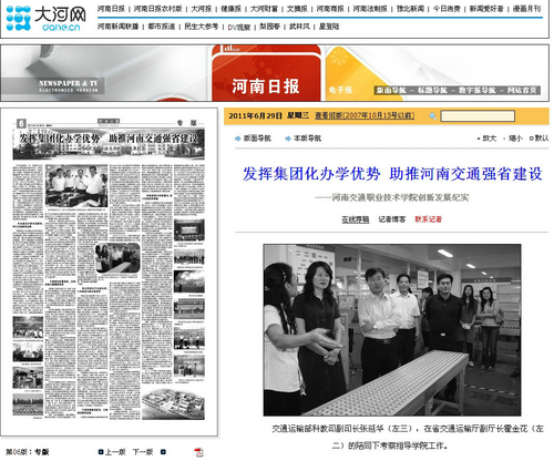 2011年6月22日,河南交通职业技术学院内彩旗招展、繁花似锦、生机盎然。河南省交通运输职业教育集团2011年理事大会经过精心筹备在此隆重召开,省教育厅、省交通运输厅相关与会领导高度肯定了河南省交通运输职业教育集团和学院的工作,认为河南省交通运输职业教育集团自成立以来,不断创新体制机制,深化校企校际合作,已初步形成了主管部门重视、企业参与积极、校企结合紧密的良好发展格局,学院及交通职教集团的创新发展符合职业教育的规律,符合河南的省情,符合经济社会发展的要求,河南交院在探索职业教育集团化办学,推进教育体制机制创新和人才培养模式改革等方面,发挥了积极的引领作用。