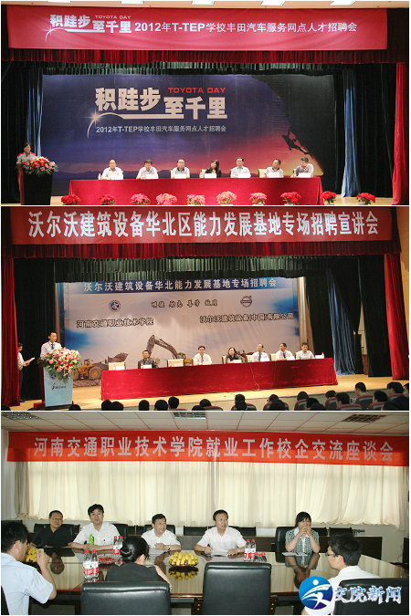 仅2012年3月份至今的短短4个月内,就有保时捷,一汽大众,一汽丰田,上海通用,沃尔沃,常林重工,裕达国贸等多家知名企业来学院举办校企合作及订单班专场招聘会,并两次组织开展大型招聘会,参加各类招聘学生人数达到5000余人次,2000余名毕业生与用人单位达成初步就业意向。400多名学生在毕业前就被用人单位提前录用。