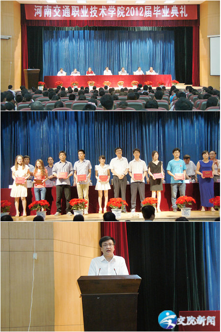 在毕业典礼上,副书记夏青宣读了《河南省教育厅关于表彰2012年河南省优秀应届大中专毕业生的决定》和《河南交通职业技术学院关于表彰2012届优秀应届毕业生的决定》。随后,院领导为获得2012届优秀毕业生荣誉称号的学生代表颁发了荣誉证书。徐强书记为毕业生代表颁发了毕业证书。 优秀毕业生代表张勇作了发言。
