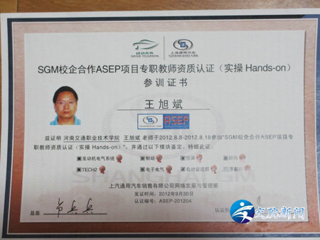 近日,在上海通用汽车培训中心进行的首批SGM合作院校项目专职教师铜级实操认证中,我院ASEP项目专职教师王旭斌以优异的成绩通过了上海通用的铜级认证,该认证的获得体现出我院教师过硬的教育教学能力和技术素质,同时也将进一步提升了我院ASEP项目教师的教学水平。
