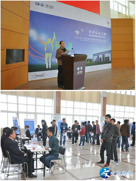 4月18日,2013一汽-大众第七届TQP班经销商专场招聘会(郑州)在我院航海路校区艺术中心三楼举行。学院副院长孙建立出席招聘会开幕式并致辞。