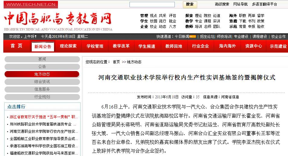 中国高职高专网:河南交通职业技术学院举行校内生产性实训基地签约暨揭牌仪式http://221.12.38.131/web/articleview.aspx?id=20130618081557160&cata_id=N004