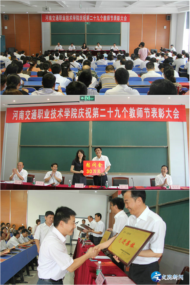 会议由院长李亚杰同志主持。大会在激扬、雄壮的国歌声中拉开帷幕。省交通运输厅科技处处长宋华东同志宣读了省厅贺信,副厅长霍金花同志向党委书记徐强同志转交了省厅30万元节日慰问金。党委副书记张浩同志宣读了学院《关于表彰2012-2013学年先进集体、先进个人的决定》,随后,在欢快的音乐和热烈的掌声中,先进集体和先进个人代表上台领奖,“十佳教师”代表和优秀辅导员代表上台发言。