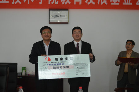 会上,校友代表、河南金途集团董事长赵文广向学院教育发展基金会捐款60万元,徐强书记向其颁发捐资荣誉证书。随后,赵文广代表校友发言,他说,母校的培养和教育、母校教师的品格和风范使他受益终身,为他后来的事业发展奠定了坚实的基础。近年来母校取得了令人瞩目的发展成就,广大校友无不为之感到振奋和自豪,他将继续为母校的建设发展贡献力量,帮助更多梦想成功的学子,推动母校教育事业蓬勃发展,与母校同呼吸、共命运。