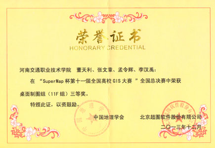 近日,第十一届全国高校GIS大赛在北京圆满落幕,我院派出的两支代表队在本次大赛斩获佳绩。其中,董天利等同学在桌面制图组比赛中获得全国三等奖,韩玉丰等同学在应用开发组比赛中获得全国优秀奖,另外,三位老师获得了大赛优秀指导教师的荣誉。我院也是本次比赛河南省代表队中唯一入围决赛并获奖的高职院校。