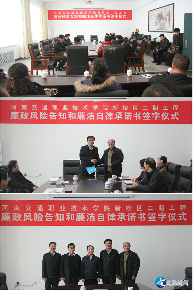 签订廉洁自律承诺书 1月10日下午,省纪委驻省交通运输厅纪检监察组组长王晓共在学院党委书记徐强、院长李亚杰的陪同下,视察学院新校区二期工程建设情况,并参加学院新校区二期工程廉政风险告知和廉洁自律承诺书签字仪式。签字仪式由院长李亚杰主持,学院相关领导及所有中层干部参加了此次会议。 学院组织召开新校区二期工程廉政风险告知和廉洁自律承诺书签字仪式主要是为进一步增强学院全体管理人员特别是新校区二期工程建设指挥部所有工作人员在工程建设过程中反腐倡廉、廉洁自律的使命感和责任感,督促其干干净净工作,踏踏实实做人。签字仪式上,院纪委书记赵兰州和院党委副书记、新校区二期工程建设指挥部指挥长张浩分别宣读了新校区二期工程廉政风险告知书和廉洁自律承诺书,新校区二期工程建设指挥部指挥长张浩代表指挥部与学院党委书记徐强签订了廉洁自律承诺书,并庄严承诺,自觉接受学院党委、相关部门和全院师生的监督,争取把二期工程建成优质工程、阳光工程、廉洁工程。 徐强代表学院党委承诺,绝不随意插手、干涉新校区二期工程建设的具体事务,并对新校区二期工程建设指挥部提出了三点具体要求,一是在思想认识上,筑牢“不想腐”的思想防线,二是在制度建设上,健全“不能腐”的防范机制,三是在监督制约机制上,构建“不易腐”的运行体系。他希望大家要保持清醒头脑,严格履行廉政承诺,慎用手中权力,不冒违纪违法的风险,不过提心吊胆的日子,珍惜生活、珍惜生命、珍惜家庭,不被“糖衣炮弹”打开缺口,自己不“下水”,也不拉别人“下水”,经得起历史检验,不辜负上级领导和全院师生的信任和期望。 王晓共组长在讲话中指出,近年来,高校基建工程建设是高校腐败案件多发的重点领域,部分高校领导因此落马令人非常痛惜。去年以来,我国党风廉政建设发生了可喜的变化。在这种情况下,风险告知是责任、是提醒、是关爱,对所有参会人员也是一种教育。他希望大家珍惜手中权力,明确身上责任,做好本职工作,相信学院新校区二期工程能够建得更好。 (供稿:宣传部 文/于卫雁 图/黄朔) |