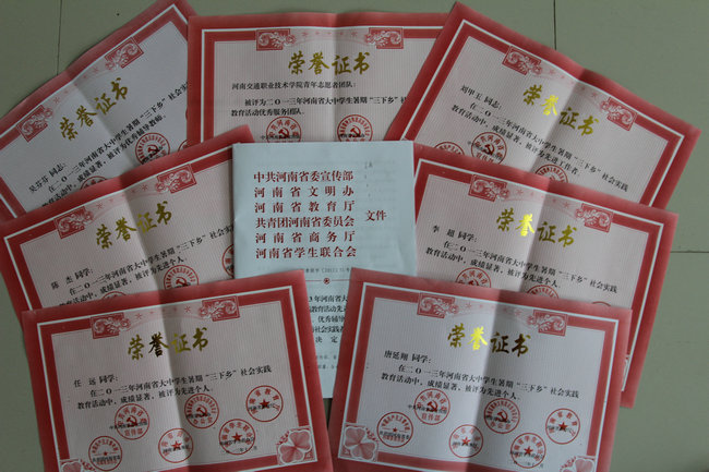 近日,中共河南省委宣传部、省文明办、省教育厅、团省委、省商务厅、省学联六家单位联合下发《关于表彰2013年河南省大中学生暑期“三下乡”社会实践教育活动先进单位、优秀服务团队、先进工作者、优秀辅导教师、先进个人和优秀社会实践者的决定》(豫青联字〔2013〕51号),我院青年志愿者团队被授予“优秀服务团队” ,刘甲玉、冷琳被授予“先进工作者”,吴芬芬被授予“优秀辅导教师”,任远等6名同学被授予“先进个人”。