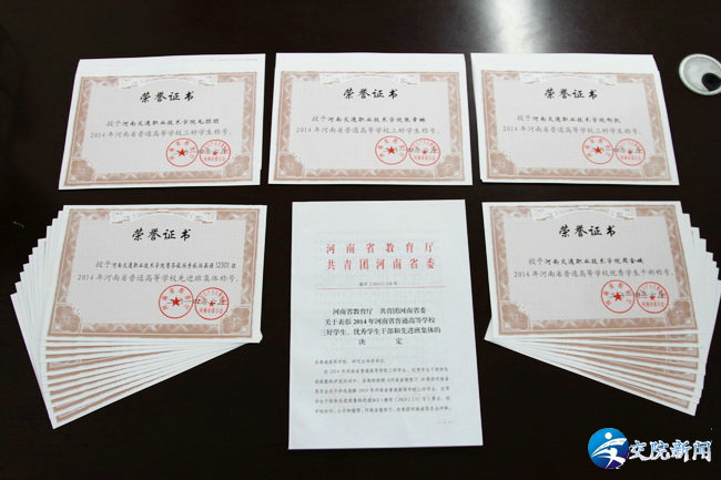经共青团河南省委、河南省教育厅严格审核,根据《河南省教育厅 共青团河南省委 关于表彰2014年河南省普通高等学校三好学生、优秀学生干部和先进班集体的决定》的文件精神,我院毛朋朋等33名学生荣获“省级三好学生”,任远等11名学生获“省级优秀学生干部”,商务旅游系旅游英语12301班等11个班级被评为“省级先进班集体”,并予以表彰。