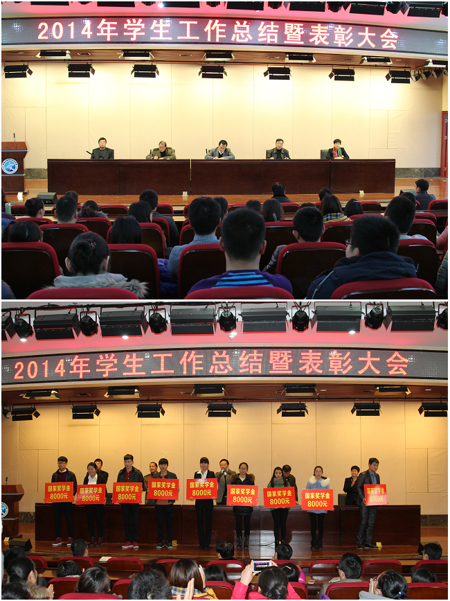 副院长孙建立宣读了《关于表彰2014年学生工作先进集体和先进个人的决定》,纪委书记赵兰州宣读了《关于发放2014年国家奖助学金、学院综合素质奖学金的决定》,并对12个先进班集体、408名三好学生、290名优秀学生干部及在学风建设月活动中取得优异成绩的166名学生进行了表彰,为学生代表颁发了证书和奖学金。