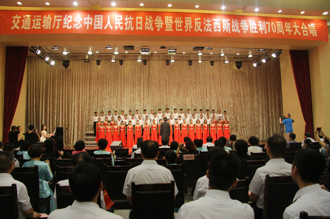 为纪念中国人民抗日战争暨世界反法西斯战争胜利70周年,8月31日下午,由省交通运输厅主办的“铭记历史开创未来”抗战歌曲大合唱在厅三楼大礼堂拉开帷幕,14支来自厅机关及直属单位的合唱团,近千名人员深情讴歌了中华民族在抗战中表现出来的伟大民族精神。厅领导郭晓明、刘兴彬、丁平、马健、徐芳与我院合唱团合影。