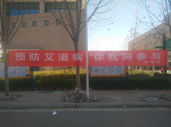 学院充分利用校园阵地优势,大力营造良好宣传氛围。在校园内悬挂“预防艾滋病,你我同参与”“奉献爱心,携手共行,共抗艾滋”的宣传条幅,利用电子大屏幕,滚动播放艾滋病防治的有关知识和宣传标语。