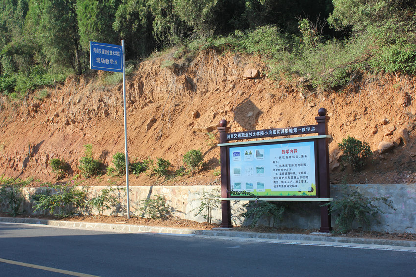 一路走来,每隔一公里左右,在道路旁的石壁上就可以看到一幅写有“河南交通职业技术学院第一教学点”“河南交通职业技术学院第二教学点”……字样的牌子,牌子的下方在地上竖立着一个宣传栏,里面清楚地写明了本教学点的教学内容以及要求学生达到的能力,并配以实景照片说明。随行介绍的公路学院市政教研室主任、小浪底实训教学基地负责人万拥军老师说:“学院对基地沿途7公里道路进行了认真的勘察,根据不同路段的特点和实际情况,安排不同的实训教学内容,使我们的教学能够因地取材,因地施教”。在七公里的道路上,学院设置了十个这样的教学点,教学内容涉及护栏、地质认知、防护网、涵洞、导线测量、路基路面等方面。