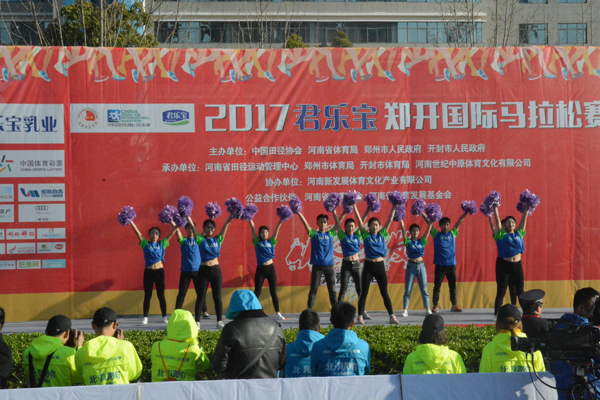 与往年不同的是,今年学院啦啦操队在2017中国郑开国际马拉松赛啦啦操大奖赛中脱颖而出,有幸在马拉松开幕式现场进行了精彩表演,为选手们加油助威。