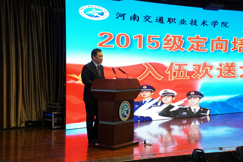 秦剑臣调研员在讲话中对学院服务军民融合发展战略、培养优秀士官的办学行为给予充分肯定。他希望河南交院全面总结定向培养士官生工作的经验,不断深化人才培养模式改革,努力为部队输送更多优秀技能技能人才,为全省高职院校创新发展做出表率。希望各位同学牢记家乡人民的殷切期望,争做有灵魂、有本事、有血性、有品德的新“四有”革命军人,忠实履行好保卫祖国安全和人民和平生活的神圣使命,为实现中华民族伟大复兴的中国梦提供坚强保障。