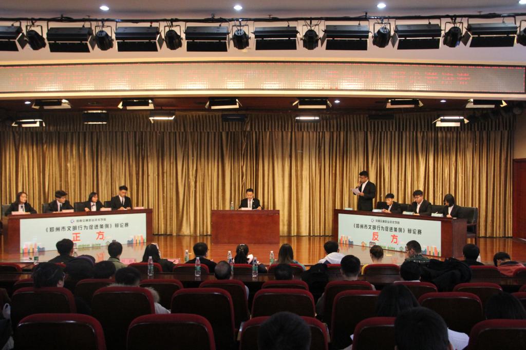 此次辩论赛分为预赛和决赛两个阶段进行。预赛由学院8个院系分别组成一支队伍参赛,根据抽签结果分成4个对阵组进行比赛,预赛获胜的4支队伍进入决赛。晋级决赛的4支队伍根据抽签结果分成2组进行比赛,获胜的2支队伍争夺冠亚军,余下2支队伍争夺季军。“文明行为主要靠自律还是他律?”“网络文明是道德约束更重要还是法律约束更重要?”“低碳生活会不会影响生活品质?”等辩题均围绕《郑州市文明行为促进条例》的相关内容选取。辩论赛分为五个环节,分别是开篇立论、驳立论、质辩、自由辩论和总结陈词。双方四位辩手你来我往、针锋相对,现场气氛十分激烈。