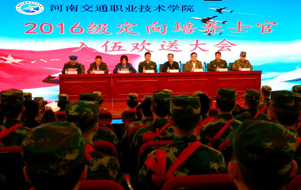 12月26日上午,学院在东校区隆重举行仪式欢送2016级定向培养士官光荣入伍。河南省军区动员局局长、省征兵办公室主任王昌龄、河南省交通运输厅副巡视员宋华东、省交战办主任关毅、二七区武装部政委李如飞、学院党委书记曹焱、院长李强,空军、火箭军接兵人员等出席大会。