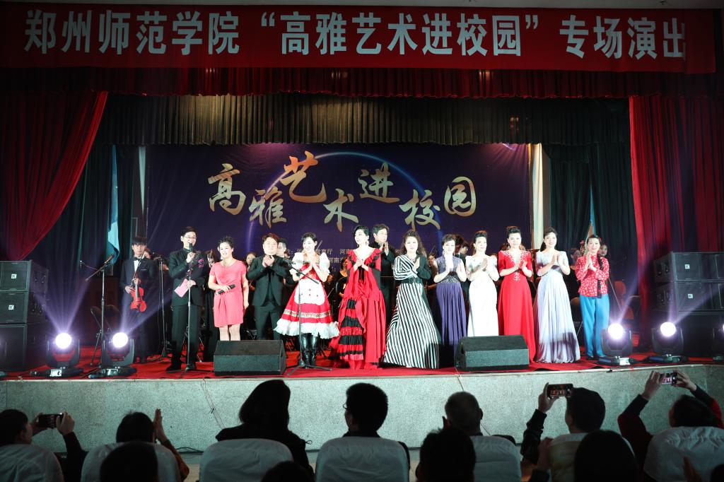 演出在经典歌剧《白毛女》的优美旋律中拉开帷幕,在河南省歌舞剧院教授张跃的指挥下,郑州师范学院音乐与舞蹈学院的师生们为观众带来了中外经典歌剧唱段《珊瑚颂》、《红梅赞》,《乡村骑士》间奏曲,《卡门》序曲,《我亲爱的爸爸》,《你们可知道什么叫爱情》等十几个经典曲目。中场张跃向在座师生们介绍了管弦乐团的组成及部分乐器名称,并分别演奏了精彩片段,时而严肃庄重,时而明快活泼。指挥幽默风趣的语言与乐团的高超技艺相得益彰,让学院师生在欣赏歌剧的同时又学习了乐器的相关知识。现场座无虚席,观众与艺术家们互动热烈,气氛高涨。活动在《第二圆舞曲》和《康康舞曲》的优美旋律中圆满落下帷幕。