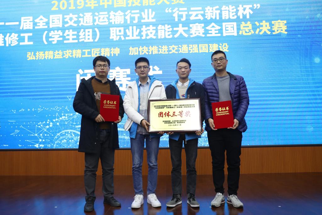 11月19日,2019年中国技能大赛——第十一届全国交通运输行业职业技能大赛在天津交通职业学院隆重开幕,来自全国20多个省市的44个代表队参加了本次大赛。经过三天的激烈角逐,由汽车学院指导教师张俊停、董隆和张曙光、李金程两名学生组成的学院代表队荣获全国团体三等奖。