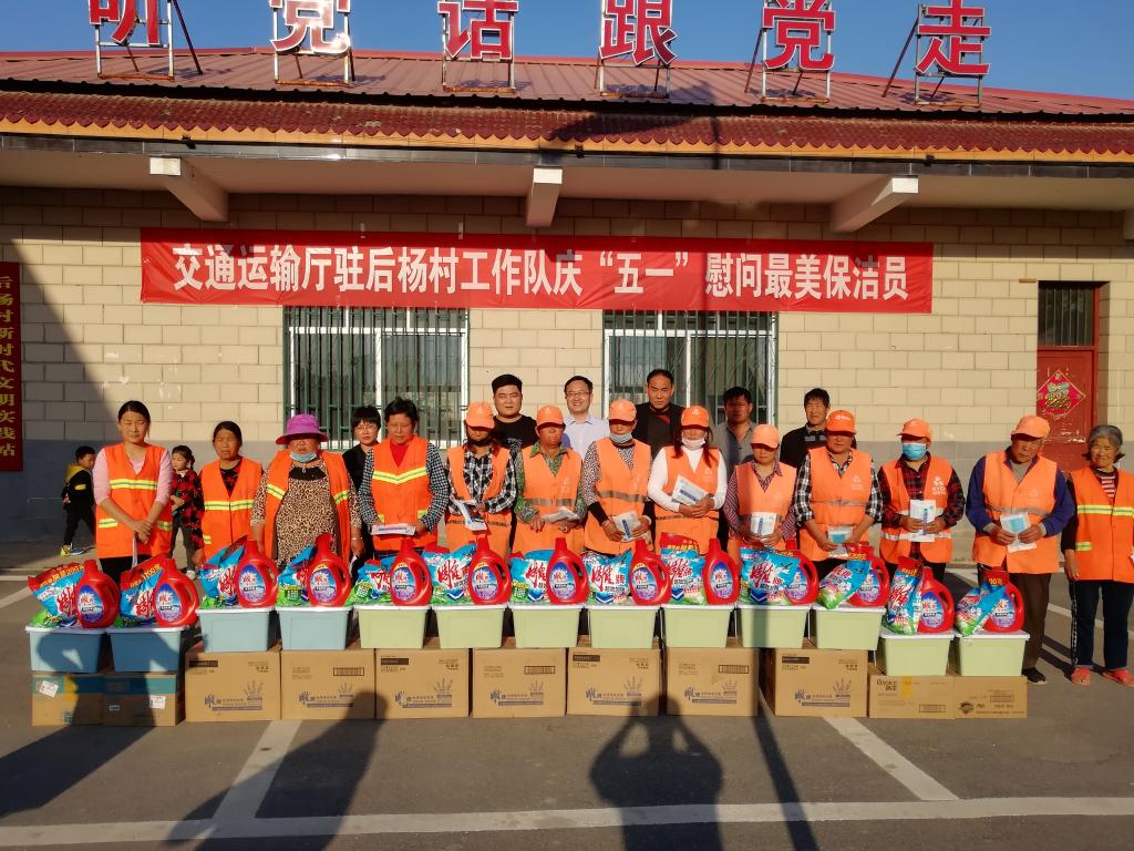 在“五一”国际劳动节来临之际,4月28日,学校选派的交通运输厅驻上蔡县后杨村帮扶工作队,对全村十余位保洁员开展慰问活动,工作队为保洁员们送来了劳保用品、遮阳帽和口罩等慰问品。