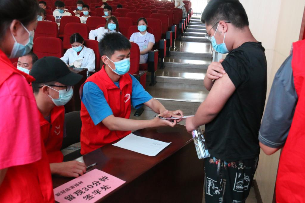 临时接种点划分为等候、登记、接种、留观四个区域。登记处设有问询处,医务人员向接种者告知接种禁忌以及接种疫苗注意事项等内容,接种者在接种疫苗知情同意书上确认签字,再录入个人信息,然后进入接种区接种疫苗。接种区医务人员再次向接种者确认是否有药物过敏史,并告知注射疫苗后注意事项。注射疫苗后,接种者在留观区观察30分钟后无异常反应,便可让工作人员确认签字后离开现场。整个接种过程,我校严格落实疫情防控相关要求,接种人员全程佩戴口罩。