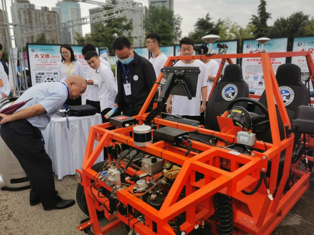 展会现场,我校众多黑科技展品吸引了省教育厅、省农业厅、省总工会等单位与会领导及各方参会人员驻足观看、咨询、体验。曹焱介绍了学生自主研发的物流黑科技产品——L3级自动驾驶实训车,以及河南交院工程技术集团有限公司主导研发的玄武岩纤维等应用成果。