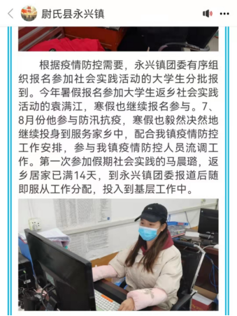 在疫情防控仍然严峻复杂的形势下,在学校多次参加志愿服务活动的他,积极向村委会报名,投入到疫情防控这场无硝烟的战争中,帮助疫情防控执勤人员做好全村消毒工作,在卡点排查全村人员出入情况,并开展信息登记工作。青春志愿行,奉献新时代。为家乡奉献自己力所能及的力量。有一分热,发一份光,以青春之名步入疫情防控‘战场’。