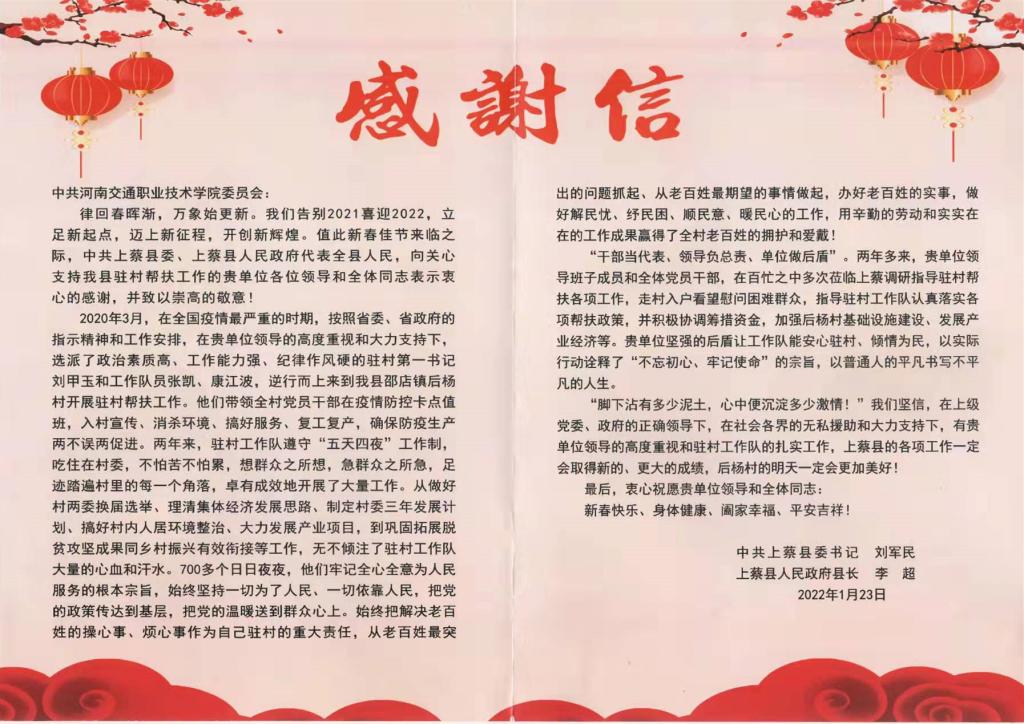 近日,学校收到上蔡县委县政府发来的感谢信,对我校选派到上蔡县邵店镇后杨村任职第一书记、驻村工作队队员的工作给予肯定并表示衷心感谢。