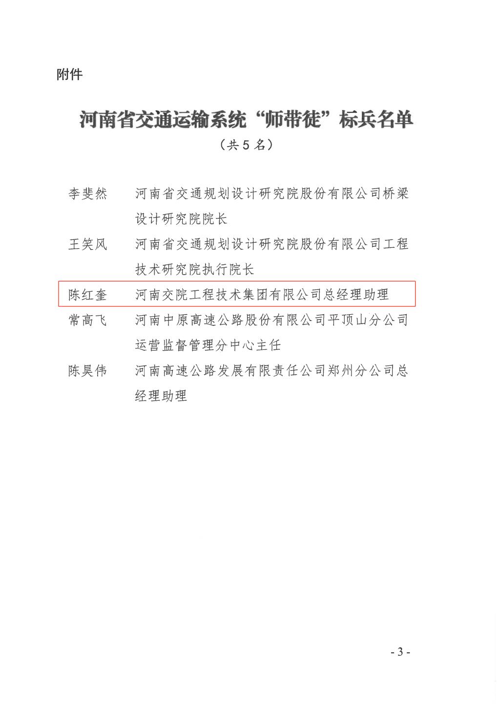 近日,河南省交通工会发布“关于命名河南省交通运输系统‘师带徒’ 标兵的决定”,决定命名5名同志为河南省交通运输系统十大 “师带徒”标兵,分别给予1万元专项补助资金。我校工程技术集团有限公司总经理助理陈红奎荣获河南省交通运输系统“师带徒”标兵荣誉称号。