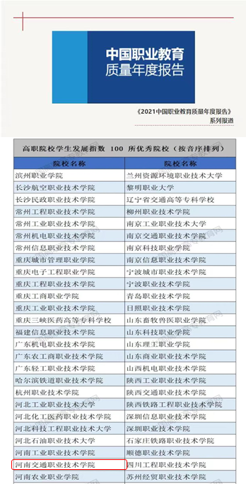 在近日公布的《2021中国职业教育质量年度报告》(以下简称“报告”)中,河南交通职业技术学院入选高职院校学生发展指数优秀院校。