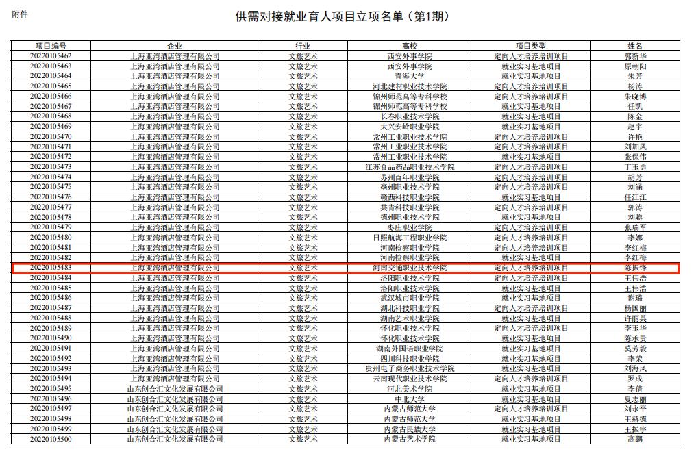 近日,教育部高校学生司发布《关于公布第一期供需对接就业育人项目立项名单的通知》(教学司函【2022】7号),我校与上海亚湾酒店管理有限公司签订的酒店管理与数字化运营专业定向人才培养培训项目,成功入选教育部就业育人项目立项名单。