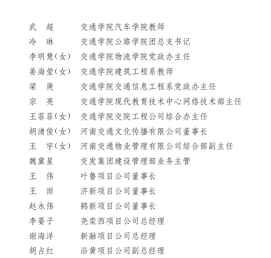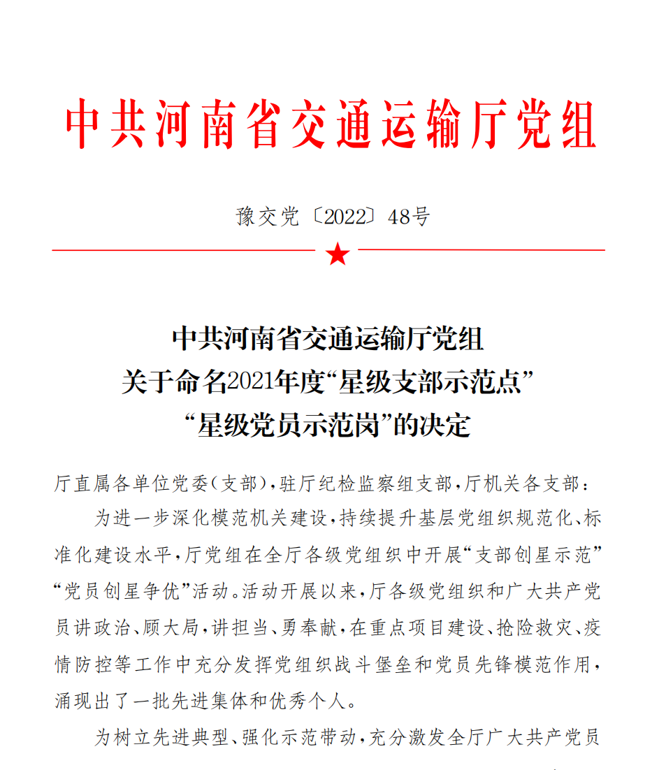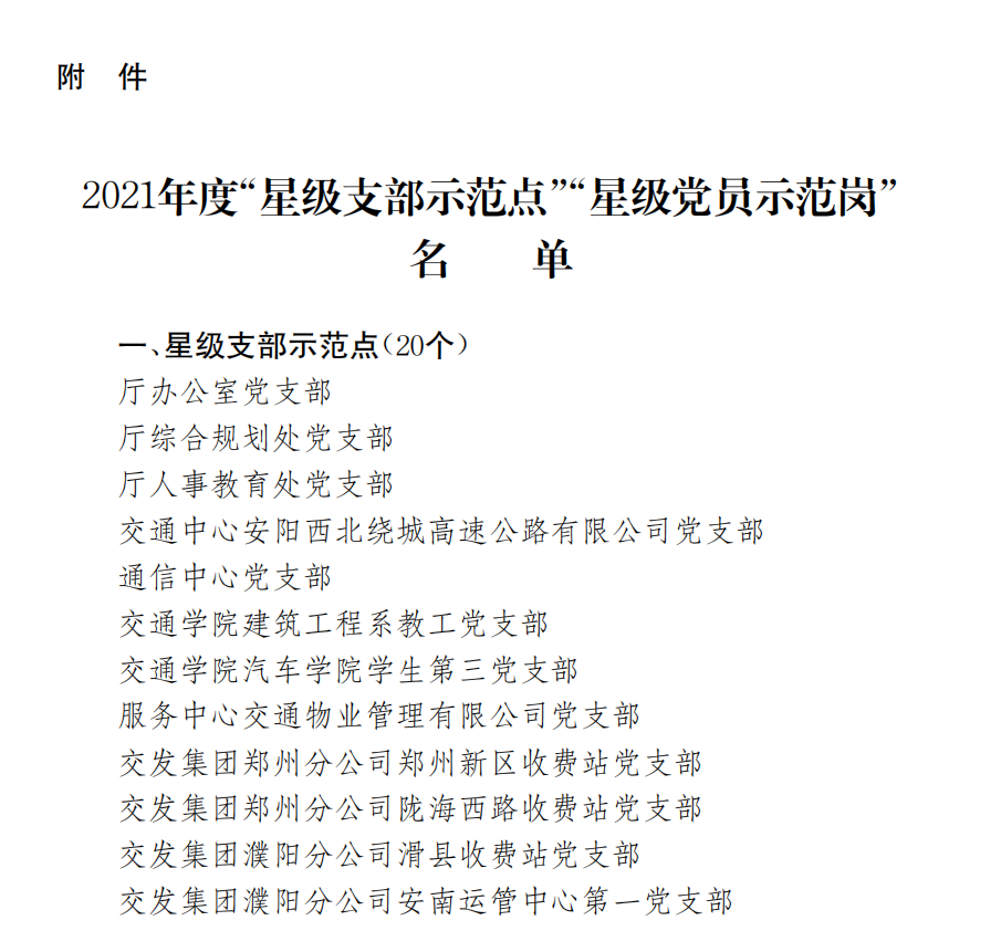 近日,中共河南省交通运输厅党组印发《关于命名2021年度“星级支部示范点”“星级党员示范岗”的决定》,我校建筑工程系教工党支部、汽车学院学生第三党支部获评“星级支部示范点”;武超、冷琳、李明慧、姜海莹、梁庚、宗亮、王菲菲7名共产党员获评“星级党员示范岗”荣誉称号。