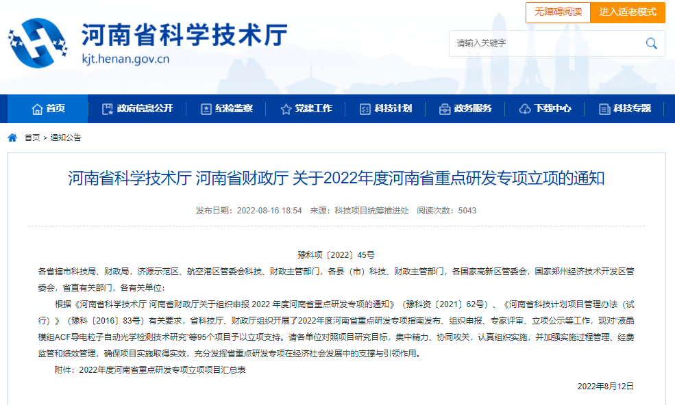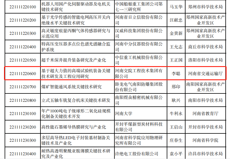 近日,河南省科技厅、河南省财政厅发布了《关于2022年度河南省重点研发专项立项的通知》,对95个项目予以立项支持。其中,由我校河南交院工程技术集团有限公司牵头承担的《基于超大力值的高端试验机装备关键技术研发及工程应用研究》科研项目入选。