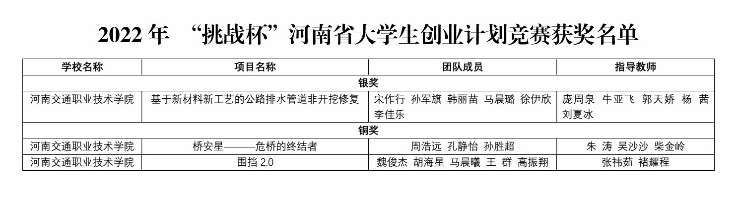 为引导和激励大学生通过广泛的社会实践、深刻的社会观察、提升创新创业能力、启迪创意思维、造就创业人才。由共青团河南省委、河南省教育厅、河南省人力资源和社会保障厅、河南省科学技术协会、河南省学生联合会联合举办的2022年“挑战杯”河南省大学生创业计划竞赛落下帷幕。我校获得省级大赛银奖1项,铜奖2项。