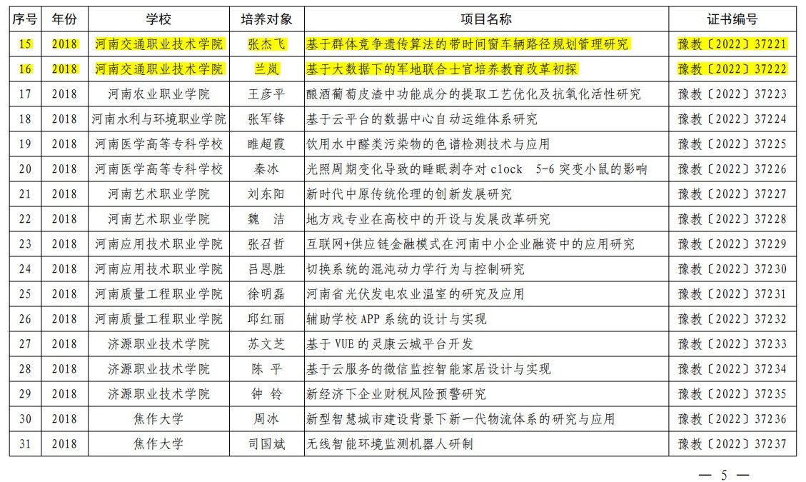 近日,河南省教育厅办公室发布《关于公布2018和2019年度河南省高等职业学校青年骨干教师培养对象考核结果的通知》(教办职成〔2022〕322号),公布全省高等职业学校青年骨干教师培养对象考核结果,我校刘喜要、张杰飞等8名教师顺利通过考核。