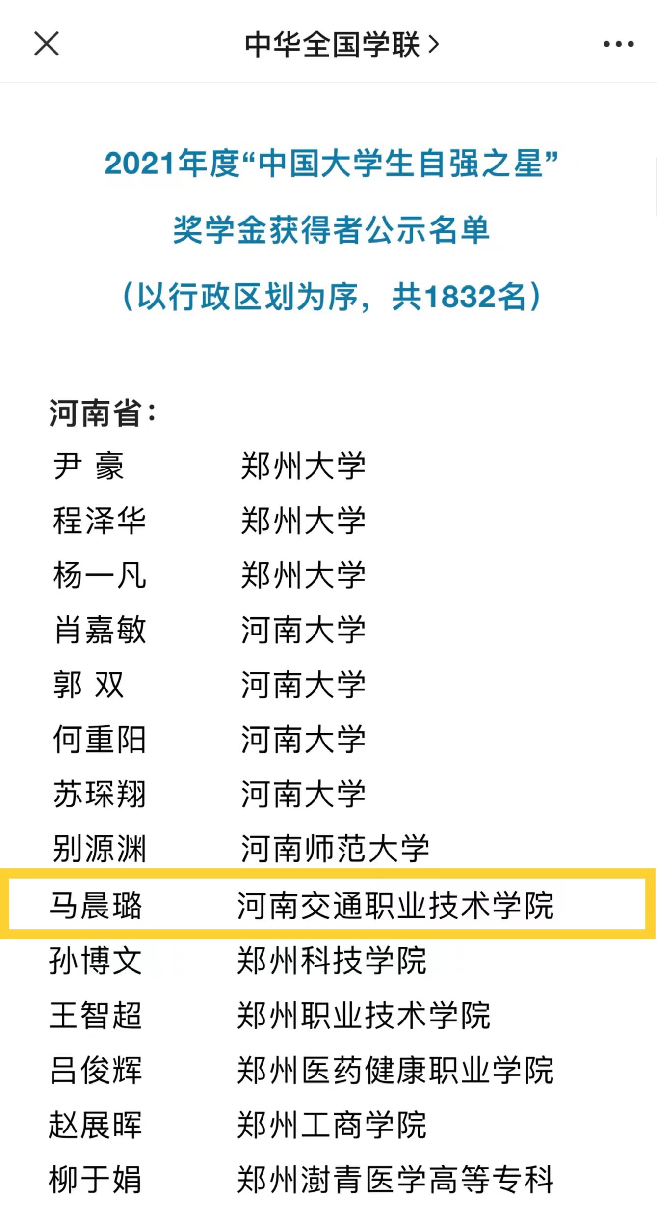 近日,2021年度“中国大学生自强之星”奖学金评选活动落下帷幕。我校学生马晨璐在评选中喜获“中国大学生自强之星”称号。