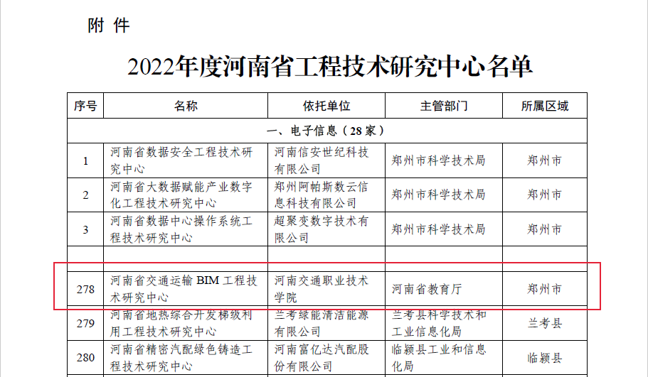 近日,河南省科学技术厅发布《关于认定建设2022年度河南省工程技术研究中心的通知》(豫科实〔2023〕1号),经单位申报、主管部门推荐、专家论证和研究等程序,由我校牵头申报的“河南省交通运输BIM工程技术研究中心”获得认定建设,标志着我校高水平科研平台建设方面取得新突破。