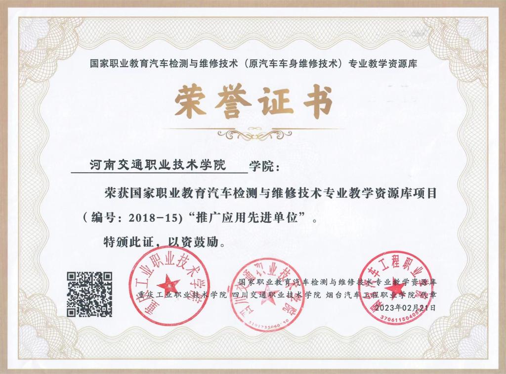 近日,我校被汽车检测与维修技术专业教学资源库共建共享联盟评为国家职业教育汽车检测与维修技术专业教学资源库项目“推广应用先进单位”,该资源库是2019年经教育部批准立项建设项目。汽车学院袁荷伟、和豪涛、李扬三位教师被评为“教学应用与推广优秀教师”,和豪涛、袁留奎、李扬三位教师荣获优质建设课程奖。