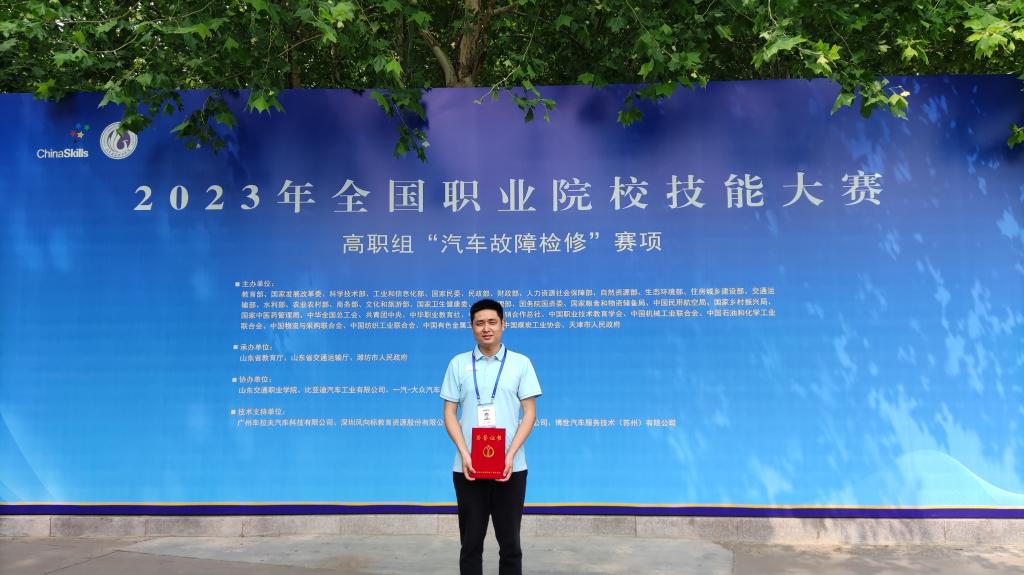 近日2023年全国职业院校技能大赛高职教师组“汽车故障检修”赛项在山东潍坊举办。经过激烈角逐,我校教师王培来自全国的60支代表队中脱颖而出,喜获大赛二等奖